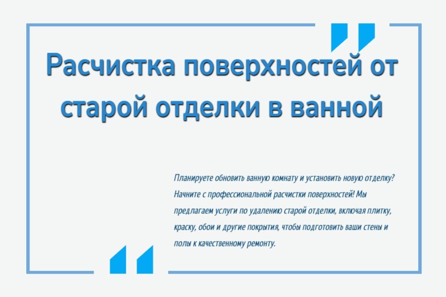 Свяжитесь с нами прямо сейчас, и мы профессионально расчистим поверхности вашей ванной комнаты от старой отделки, подготовив её к качественному ремонту и обновлению.